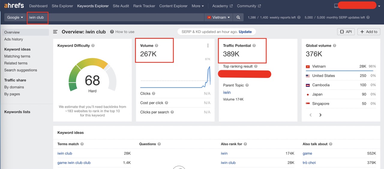 Ahrefs là công cụ đo lường độ phổ biến của từ khóa, khối lượng tìm kiếm của từ khóa là số lần người dùng tìm kiếm về chủ đề đó mỗi ngày. Theo như hình ảnh, mỗi ngày có hơn 267 nghìn lượt tìm kiếm iWin Club, thể hiện lượng khách hàng khổng lồ của cổng game bài iWin Club và con số này vẫn tăng lên mỗi ngày.