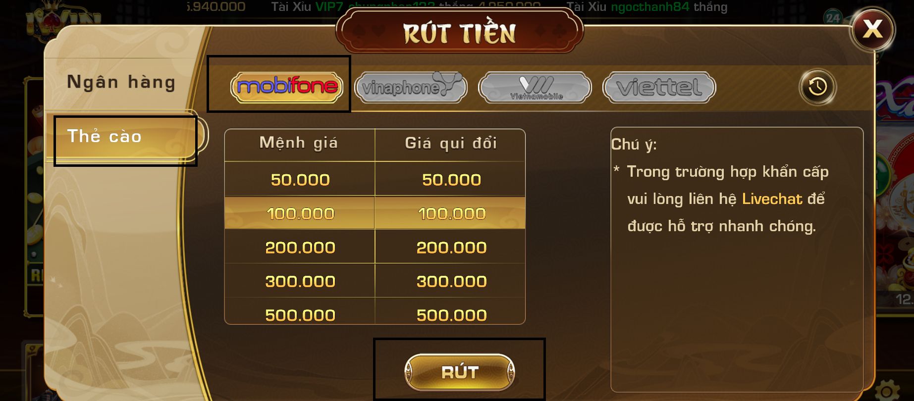 Bước 3: Chọn nhà mạng Mobifone. Sau đó chọn mệnh giá số tiền anh muốn rút về. Và cuối cùng nhấn nút Rút để chốt giao dịch.