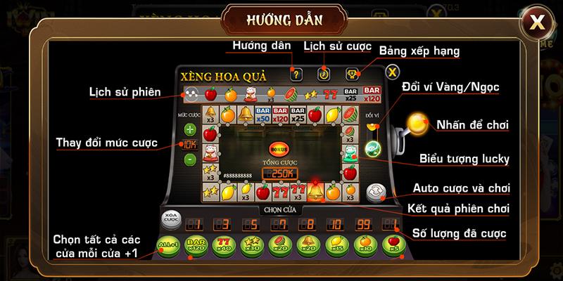 Cách chơi xèng hoa quả vô cùng đơn giản. Sẽ có một màn hình hình chữ nhật với các ô biểu tượng gồm: táo, cam, chanh, chuông. dưa hấu, sao, 777, bar 25, bar 50, bar 120. Và mỗi biểu tượng này sẽ mang đến 1 giá trị khác nhau.
